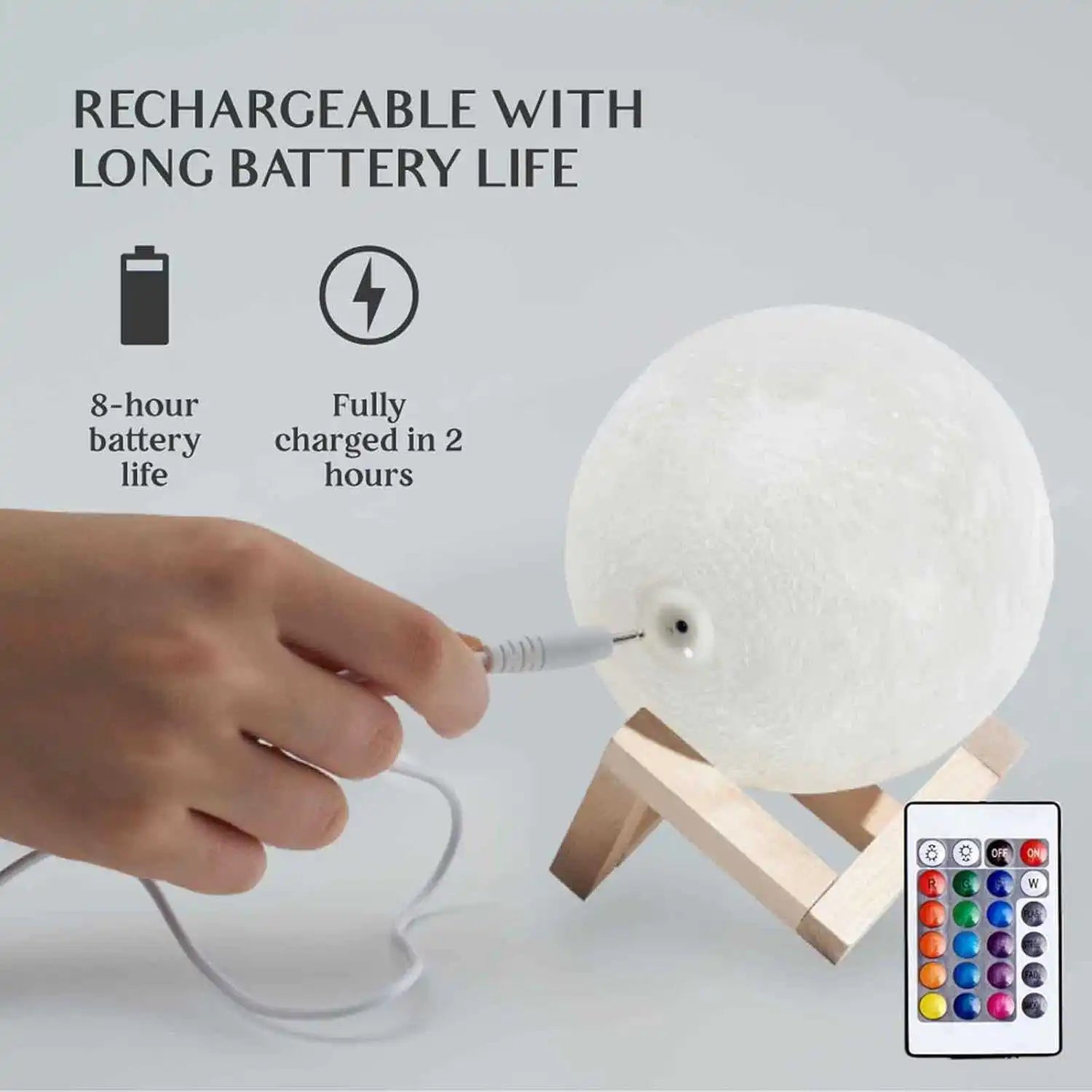 Moon Night Light w/ 128 Colors - Kids & Adults Gift - Wooden Stand & Remote/Touch Control, USB Rechargeable