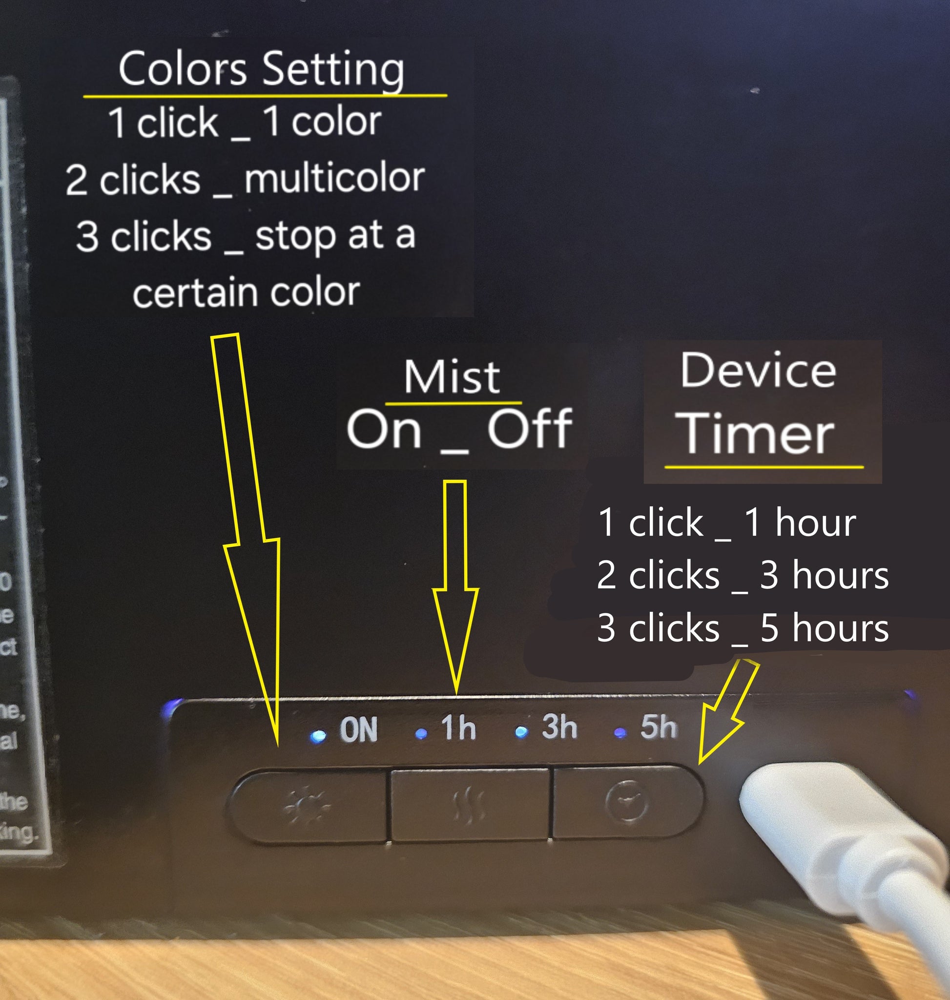 ~Simply click the button on the diffuser to turn it on and enjoy the mist. Please check our picture on this listing with further instructions on the buttons on the back.